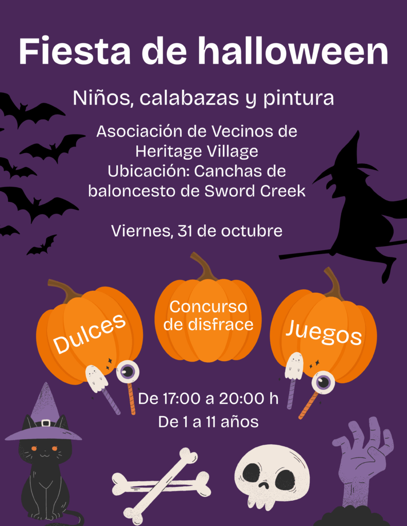 ¡Únete a la Asociación de Propietarios de Heritage Village para disfrutar de dulces, juegos y un concurso de disfraces en el Festival de Halloween!