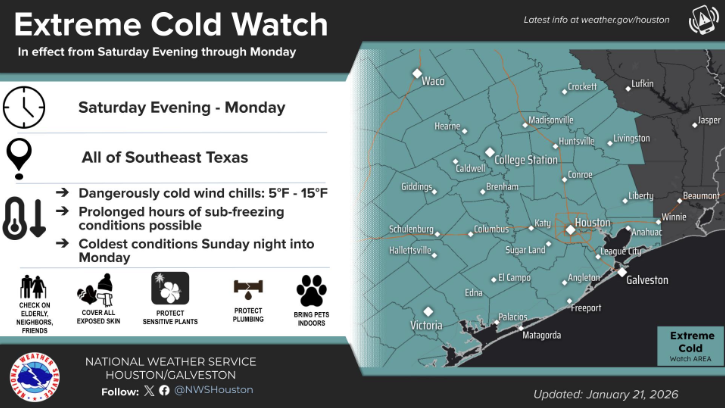 An Extreme Cold Watch has been issued from Saturday evening through early next week. Dangerously cold wind chills as low as 5 to 15 possible, with the coldest values Sunday night into Monday morning. A hard freeze is also possible Saturday night and Sunday night with lows in the 10s to lower 20s. Some areas north of I-10 may remain below freezing all day on Sunday. Now is the time to prepare! Protect people, pets, plants and pipes from cold weather!