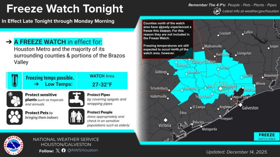 A Freeze Watch is in effect for the Houston Metro and surrounding counties from late Sunday night through Monday morning. We’re looking at low temps between 27-32°F. Don’t forget to prepare the “4 P’s”: cover sensitive plants, wrap outdoor pipes, bring pets indoors, and check on family and neighbors.